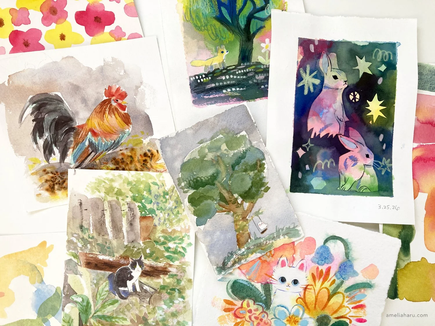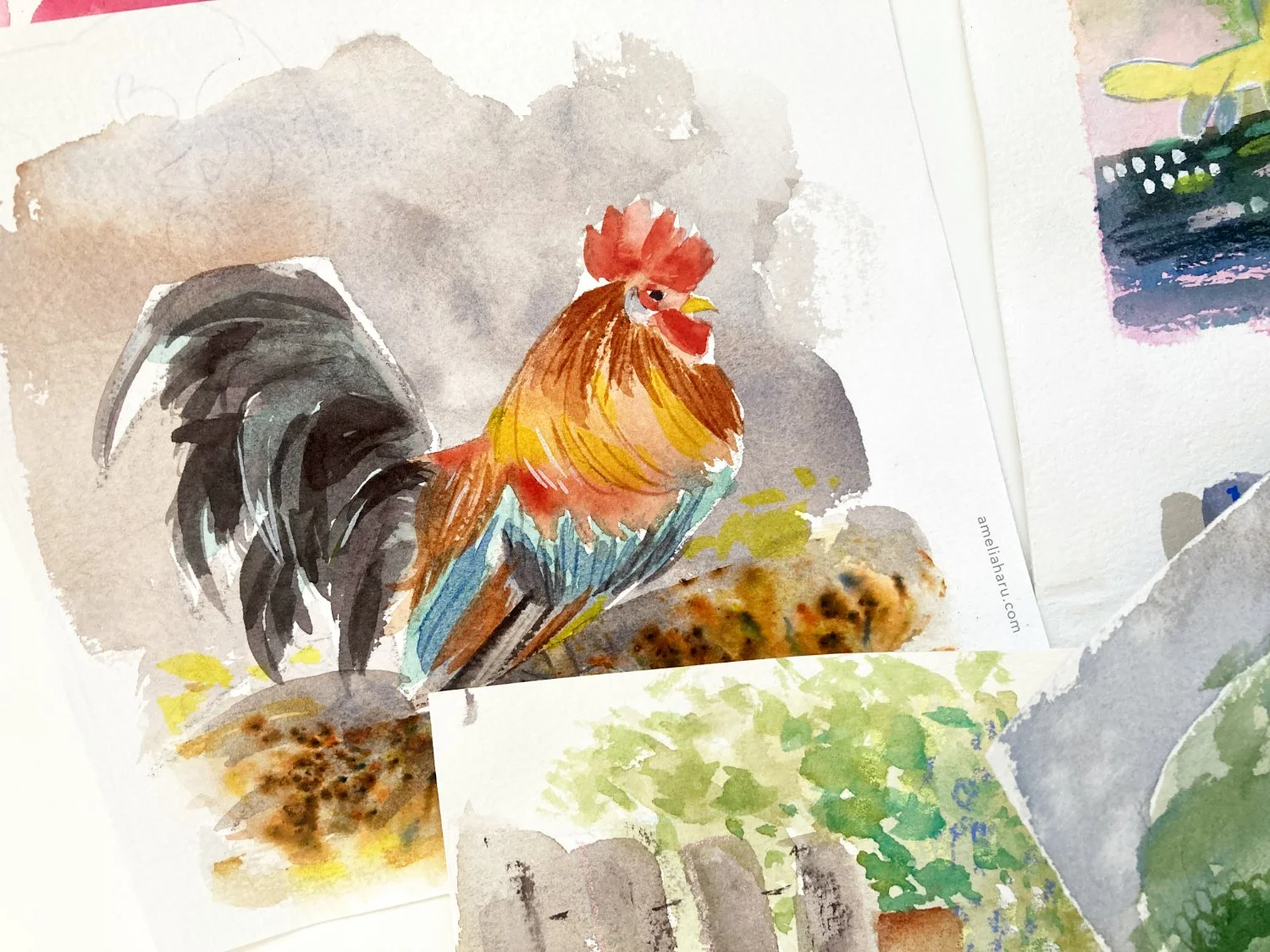 Lots of trees and animals! I think my favorite is the rooster painting, based on a photo I took during a trip to Japan🐔